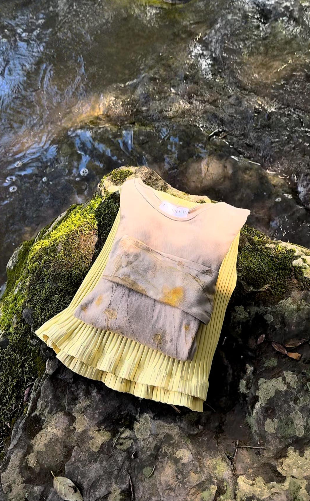We rely on local artisans for the creation of the botanical print, it is an ancient technique, completely natural, which allows to transfer on the fabric colors and shapes of natural elements such as leaves, flowers, berries, bark, roots. It is a permanent method of printing on fabric that sees the replacement of chemical products with natural acids and oxides, thus returning to the sustainable fashion process.