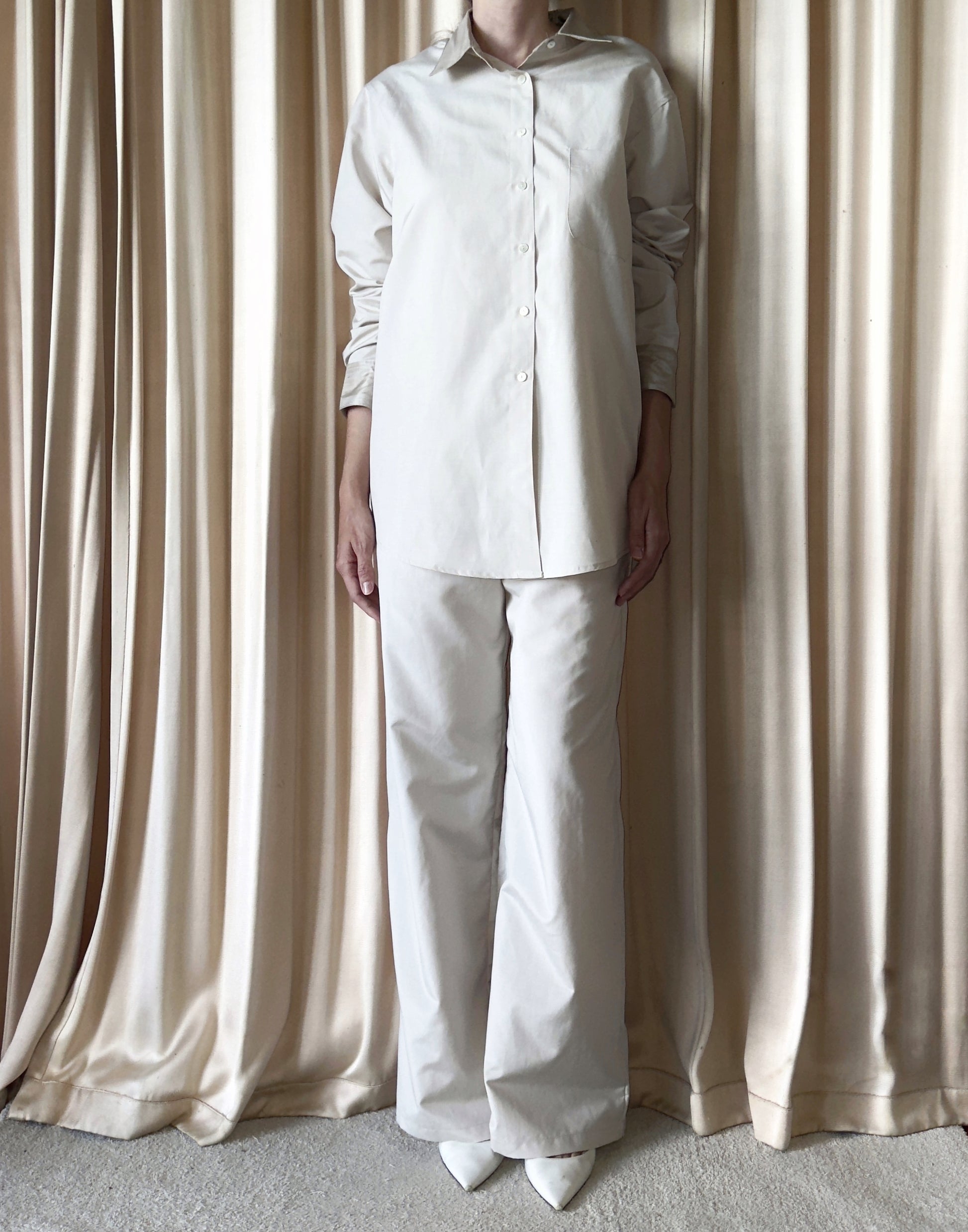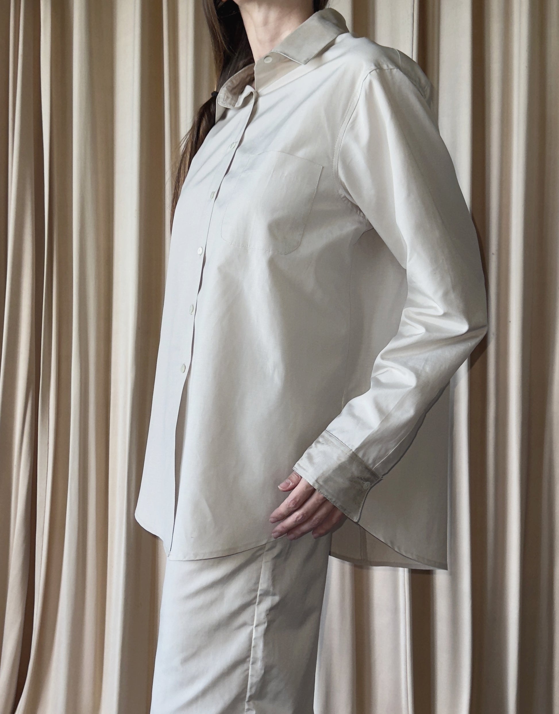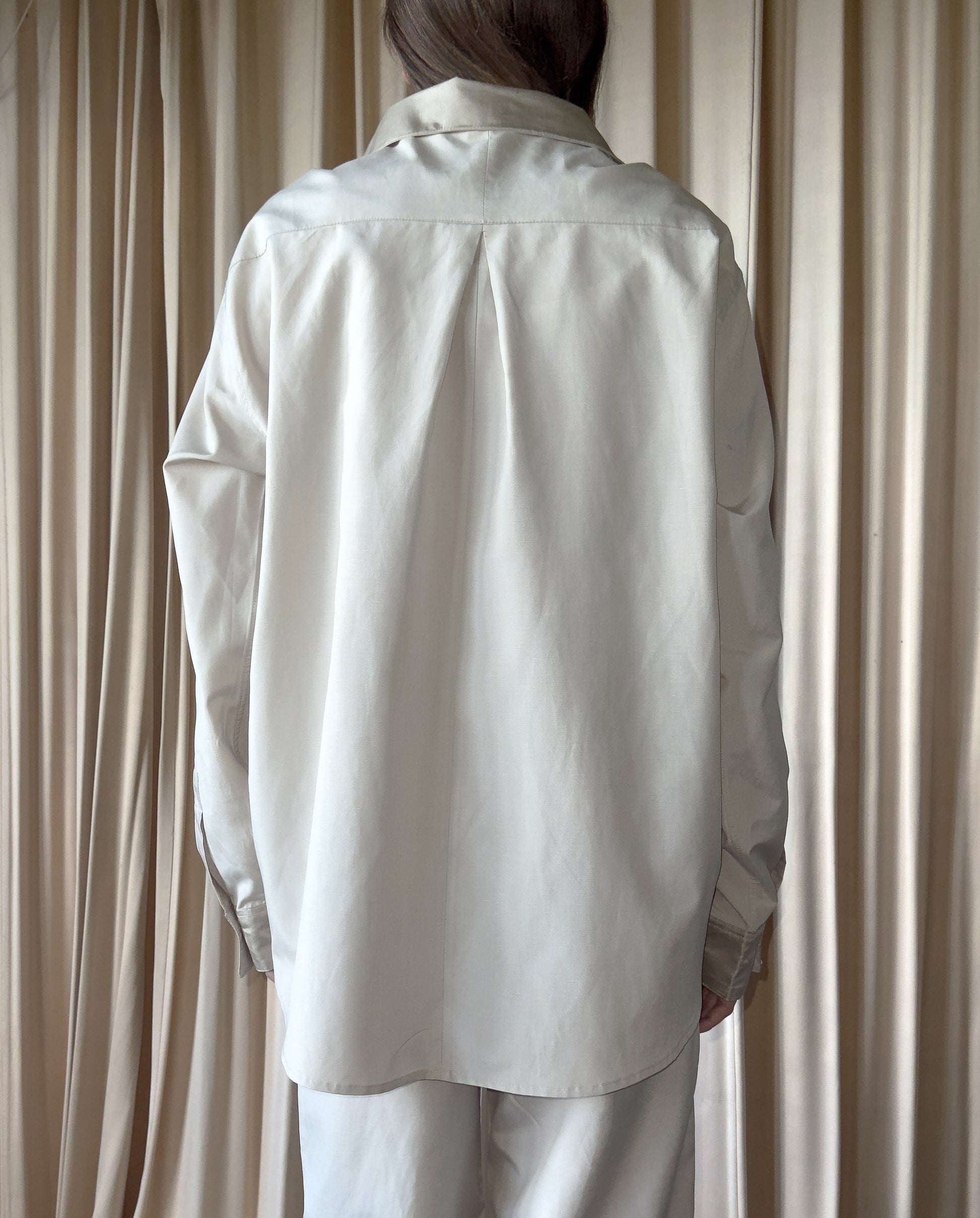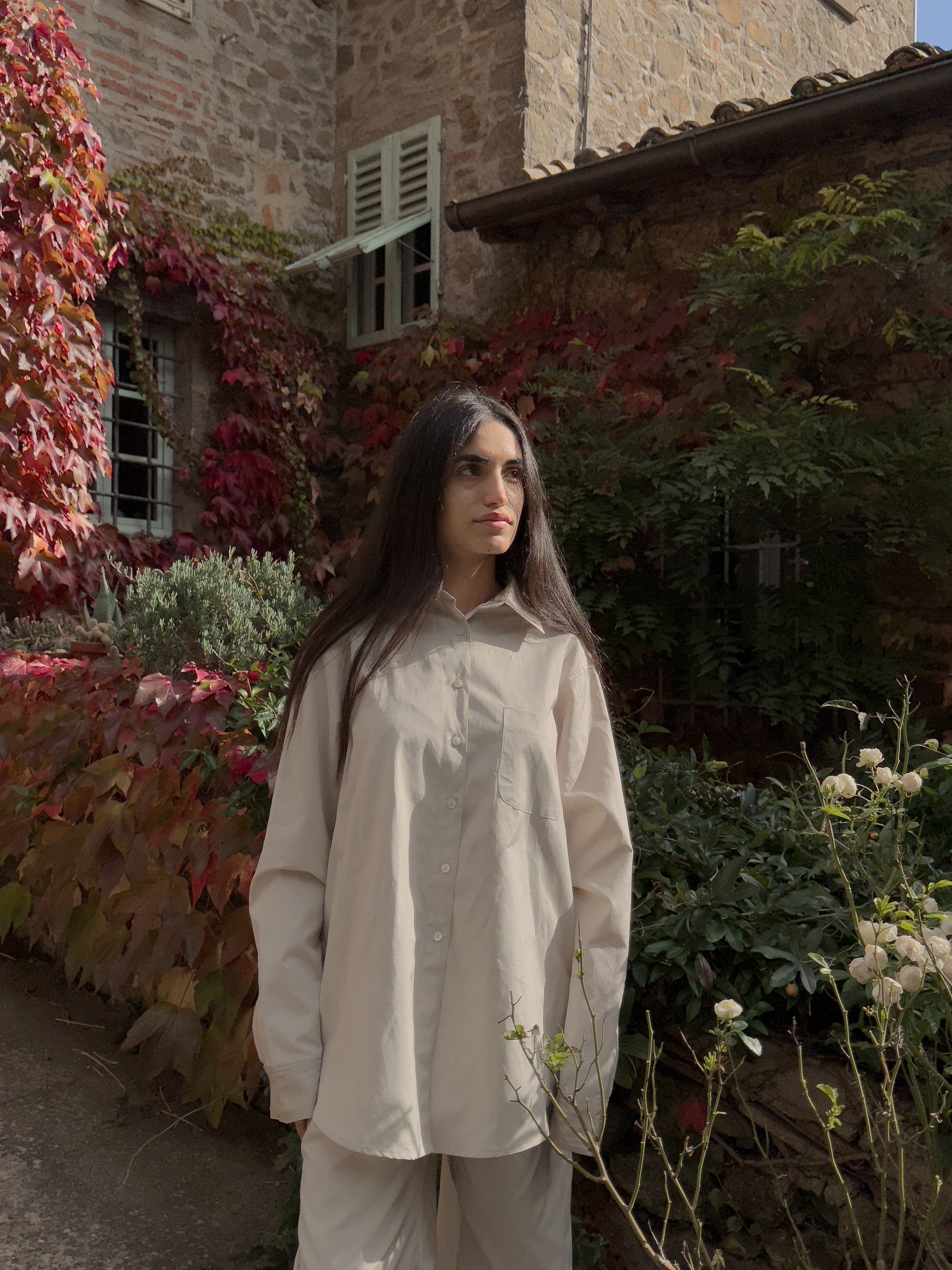 Il design oversize offre comfort e personalità, mentre i bottoni in madreperla, il taschino frontale, i polsini e il colletto in doppio tessuto raccontano una cura artigianale minuziosa. Ogni camicia è prodotta interamente in Italia, nel rispetto della materia e del tempo.