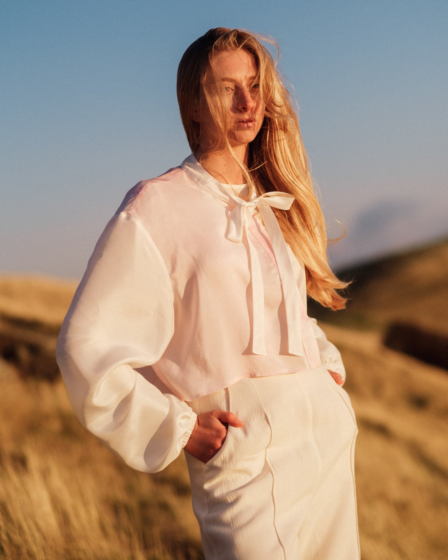 La Camicia di Seta Viollet incarna la fusione perfetta tra sostenibilità e stile sofisticato. Questa camicia, realizzata con tessuti deadstock e con una tintura naturale derivata dalla lacca e dal mais nero, rappresenta un'ode alla moda sostenibile. Il suo design crop leggermente over, l'abbottonatura nascosta e il collo con nastro la rendono un capo unico e di tendenza.