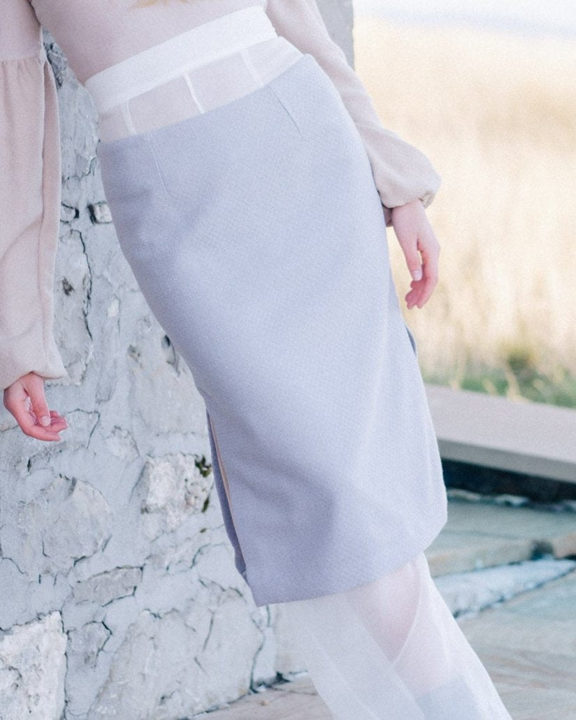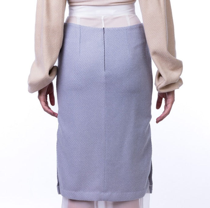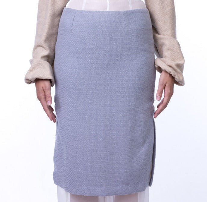 Tessuto di Lana Deadstock: La Gonna Minerva è realizzata con tessuto di lana deadstock, e fodera in seta dimostrando l'impegno verso la sostenibilità e la riduzione dello spreco tessile.