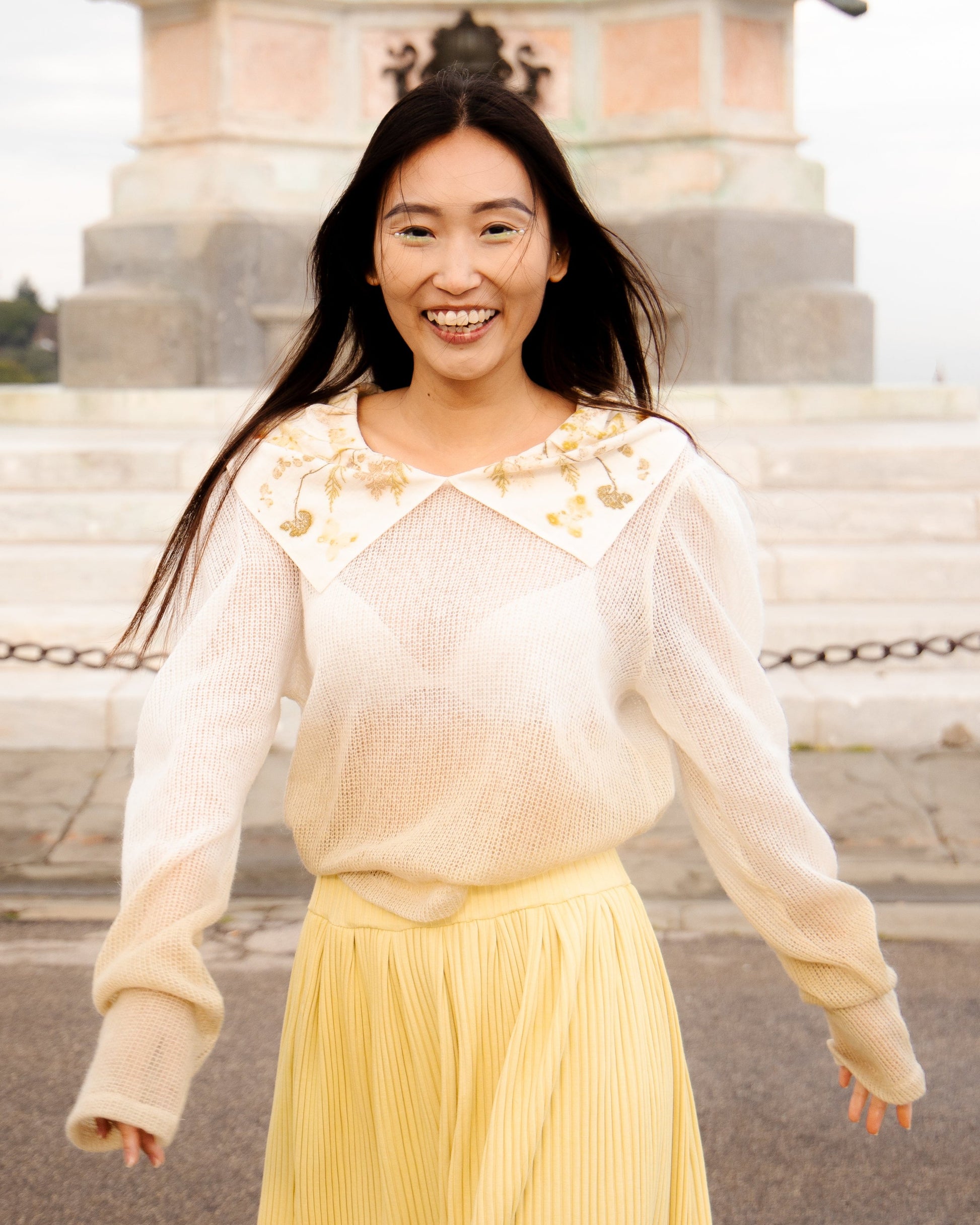 La maglia Isotta è realizzata con lana e cotone deadstock con colletto in Ecoprint e maglia di lana con tintura naturale degradé derivata dalle foglie di ulivo.