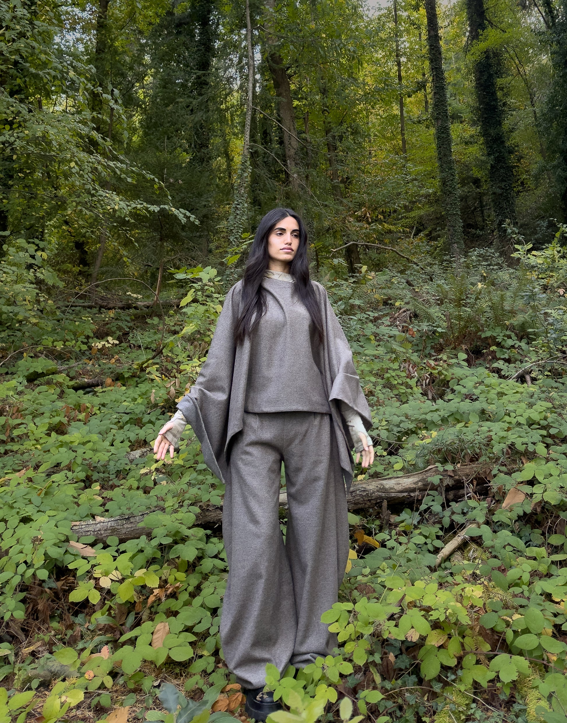 La sua forma morbida e fluida lo rende versatile e adatto a ogni corpo e occasione, mentre la ricchezza della texture in lana dona calore e profondità visiva. Privo di chiusure, Bice si indossa con naturalezza, come un gesto istintivo, e si adatta con eleganza agli outfit quotidiani o a momenti più ricercati.