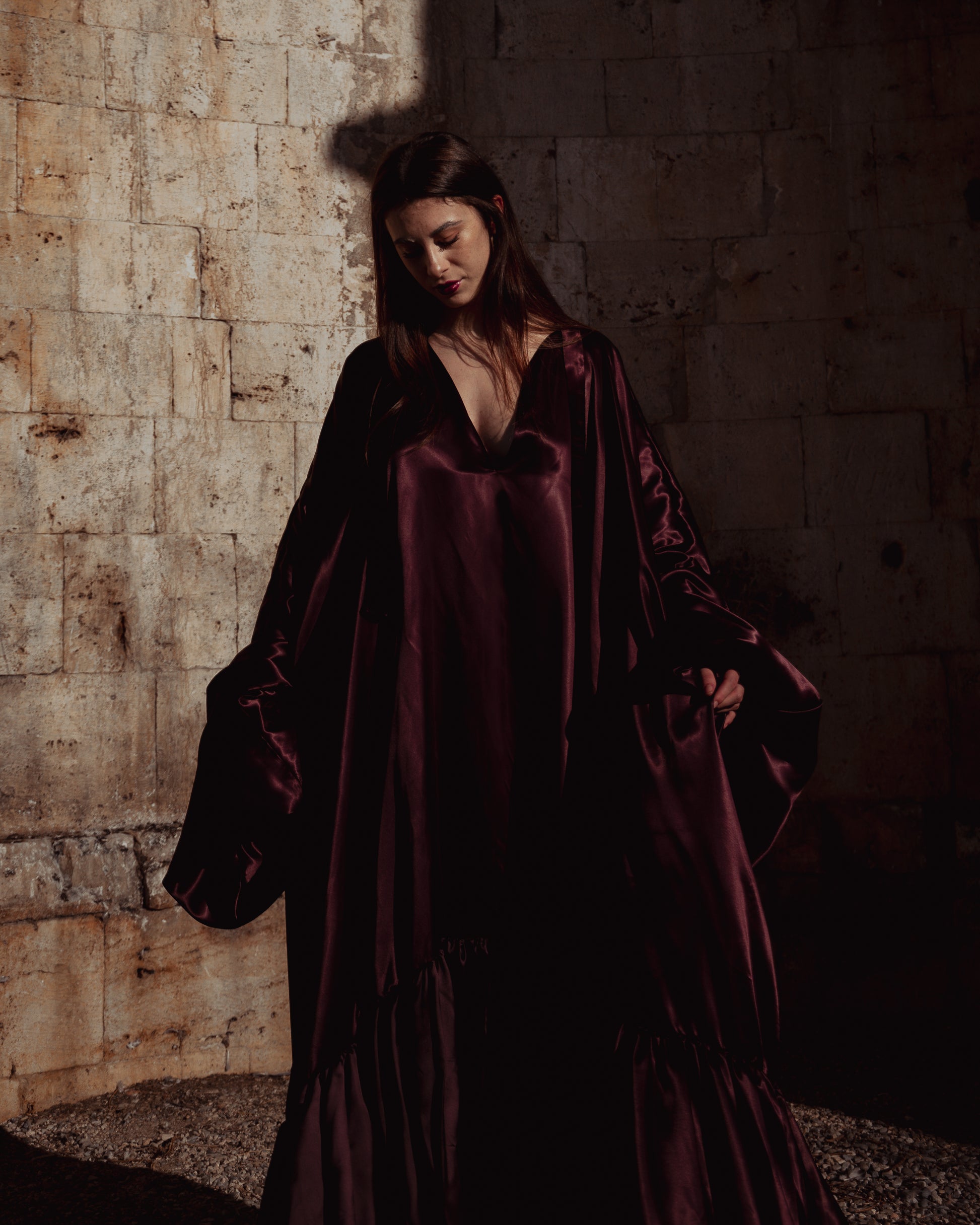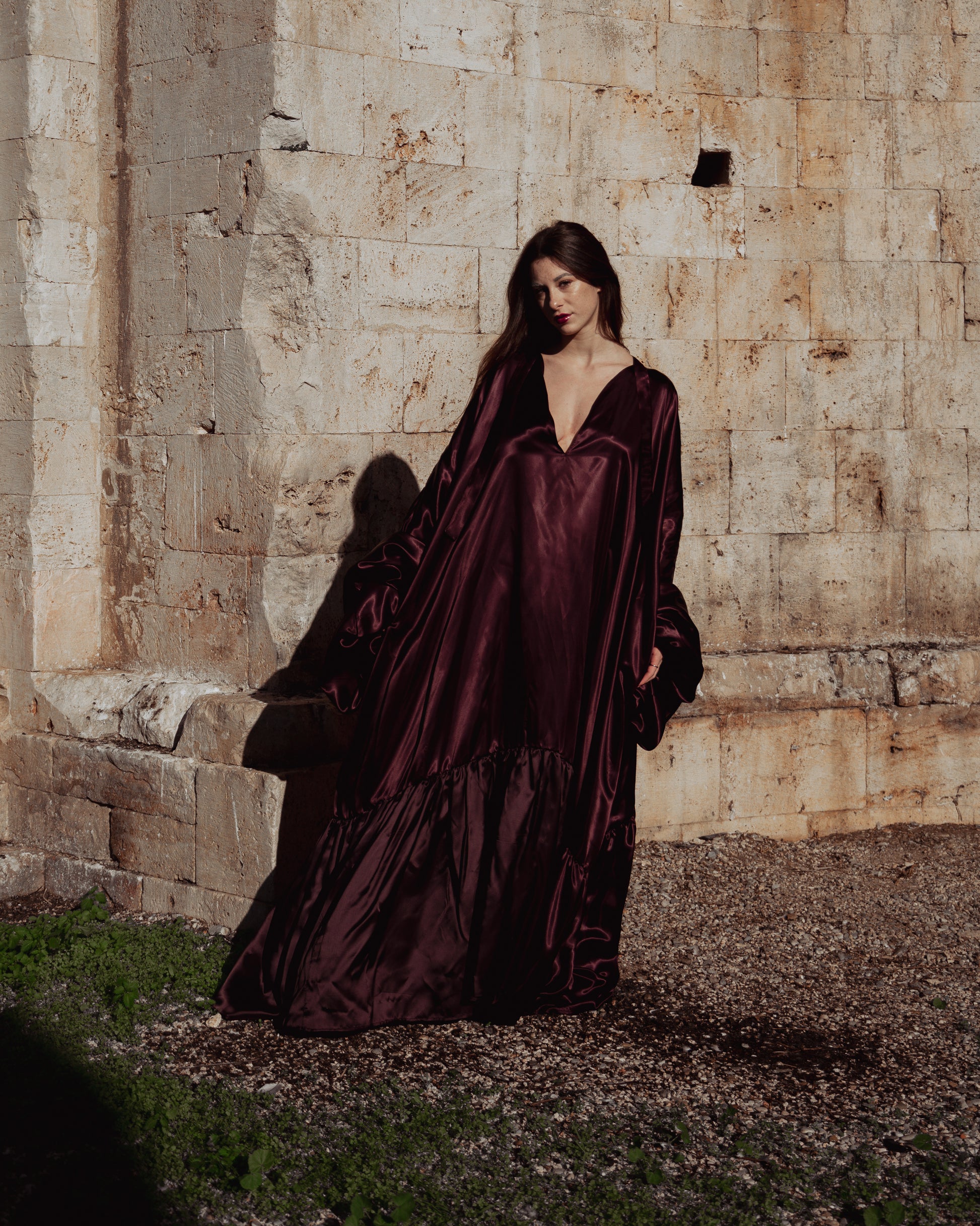 L'abito Over Wilma è un capo elegante e sostenibile, che unisce raffinatezza e attenzione per l'ambiente. Realizzato in seta 100% derivata da tessuti deadstock, questo abito presenta una tintura naturale che conferisce al tessuto una vibrante tonalità bordeaux , rendendolo unico e distintivo.